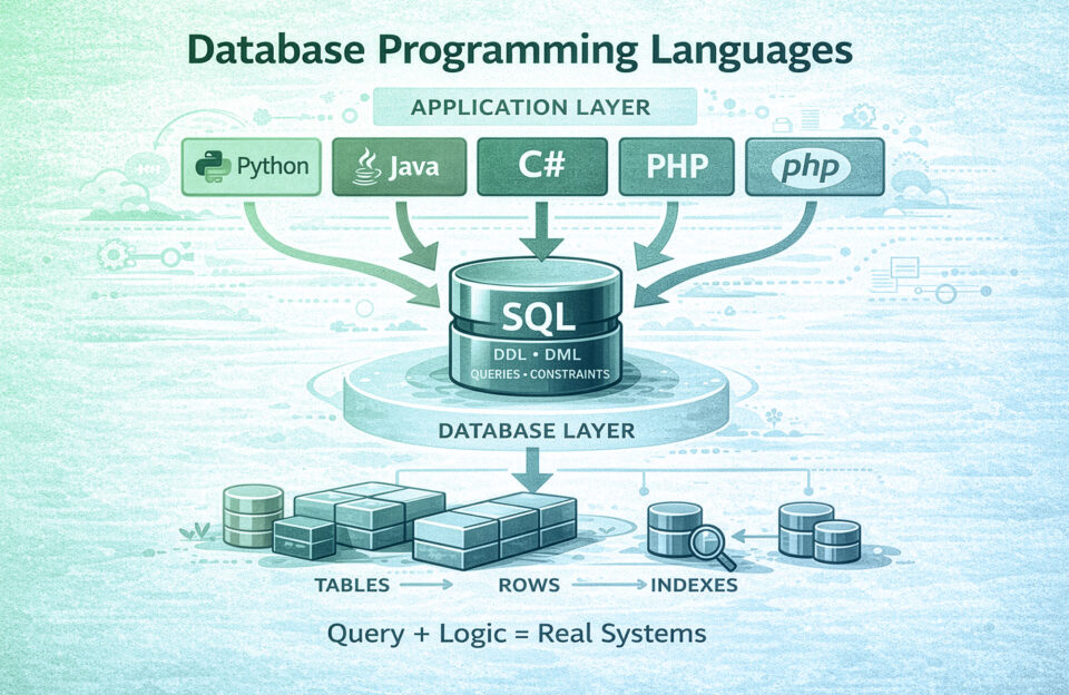 These languages define how applications interact with stored data. In relational systems, SQL defines tables, retrieves records, and enforces constraints. In practice, database programming also involves general-purpose languages such as Python, Java, C#, or PHP, which send queries and process results in application workflows.